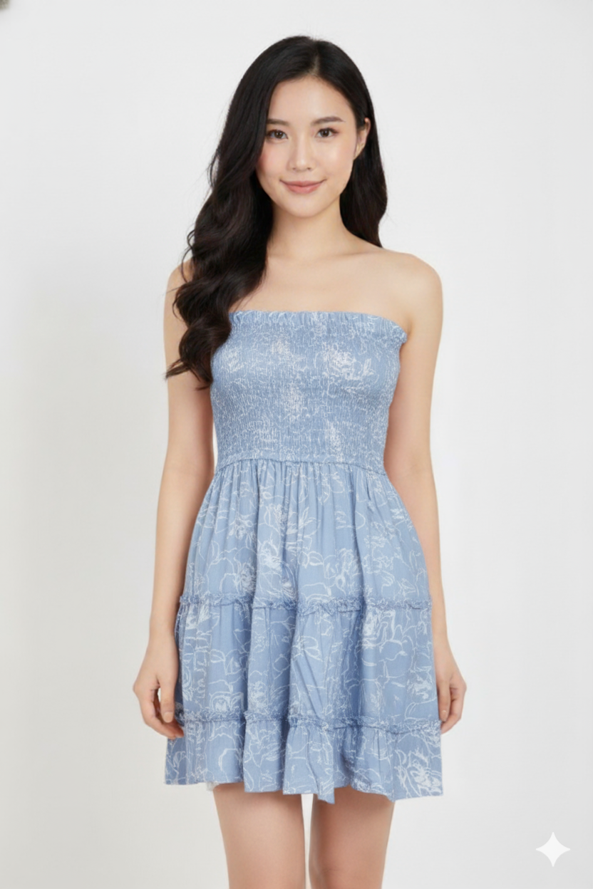 Dress Kemben Rample Rayon Daun Aldo Blue(All Size)